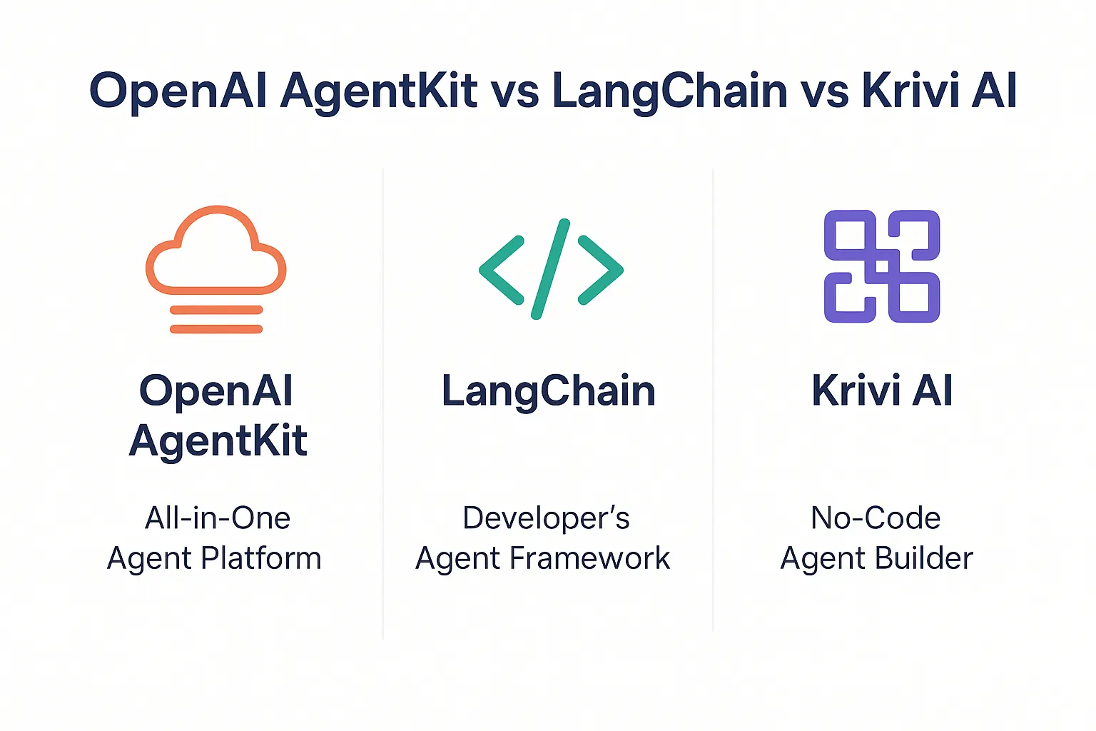 If you’re planning to ship AI agents, three names will come up again and again: OpenAI AgentKit, LangChain, and Krivi AI. Each takes a very different approach to how agents are built, deployed, and maintained.